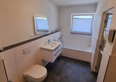 Das Badezimmer gleicht mit seiner indirekten Beleuchtung, dem Duschbereich, der Sauna und der Badewanne einer kleinen Wellness-Oase. Ein Gäste-WC inkl. zweiter Dusche ist ebenfalls vorhanden.